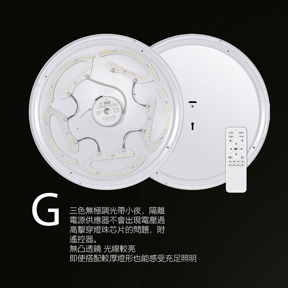 尺寸:Ø400 H100mm 材質:石化合成物 光源:(G)48W / 三色無極調光 附遙控器 (可做三色切換 不加遙控 價格另洽)