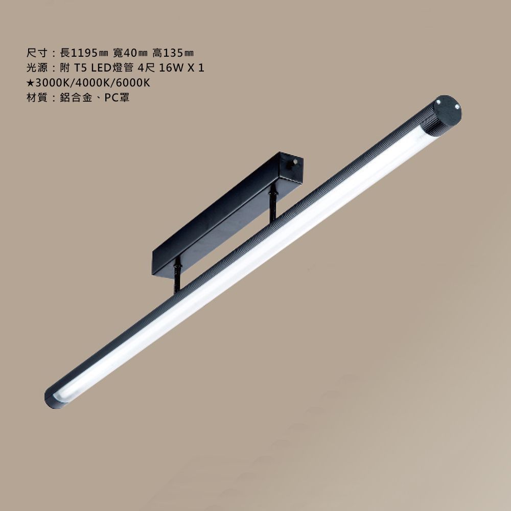 尺寸:長1195㎜ 寬40㎜ 高135㎜ 光源:附 T5 LED燈管 4尺 16W X 1 ★3000K/4000K/6000K 材質:鋁合金、PC罩