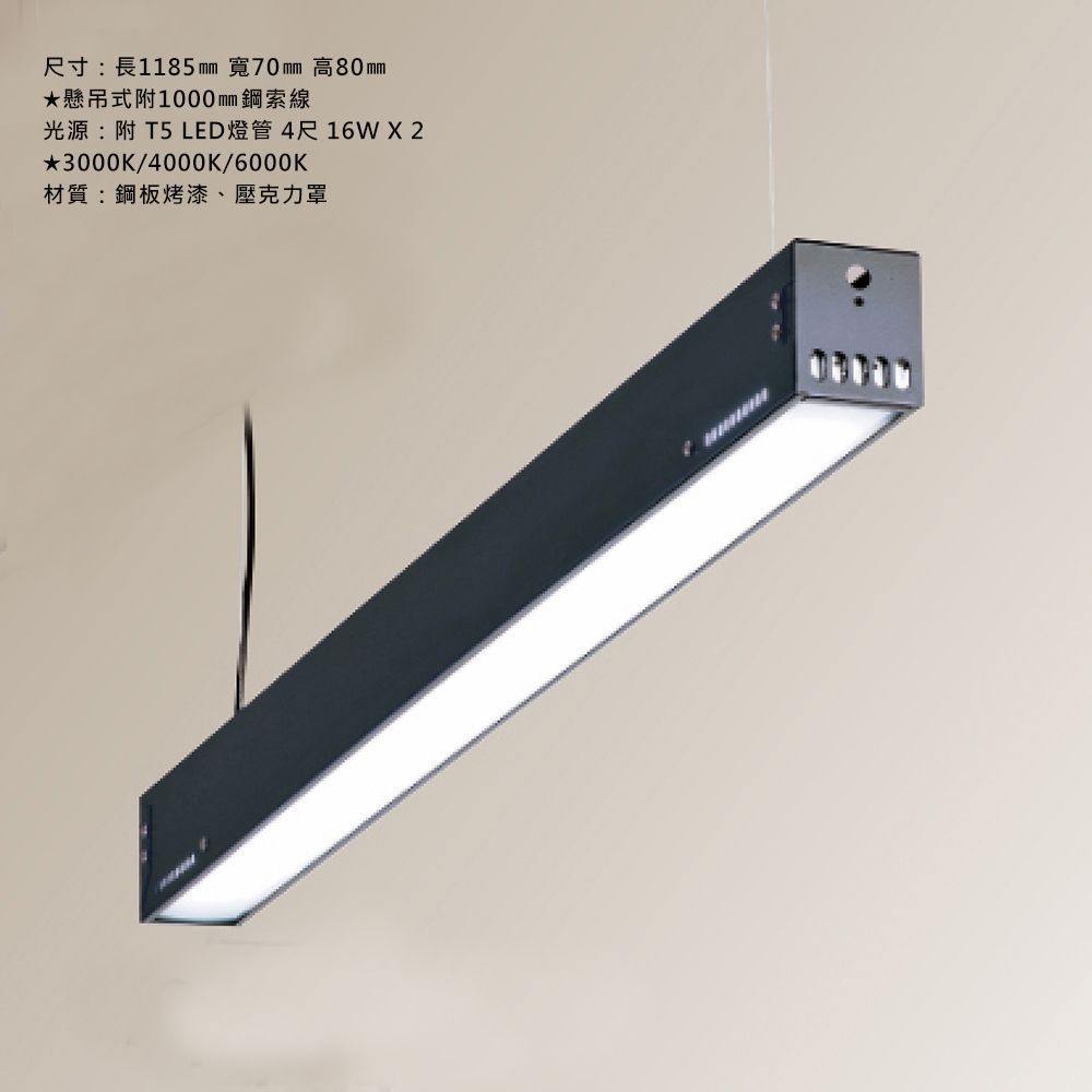 尺寸:長1185㎜ 寬70㎜ 高80㎜ ★懸吊式附1000㎜鋼索線 光源:附 T5 LED燈管 4尺 16W X 2 ★3000K/4000K/6000K 材質:鋼板烤漆、壓克力罩
