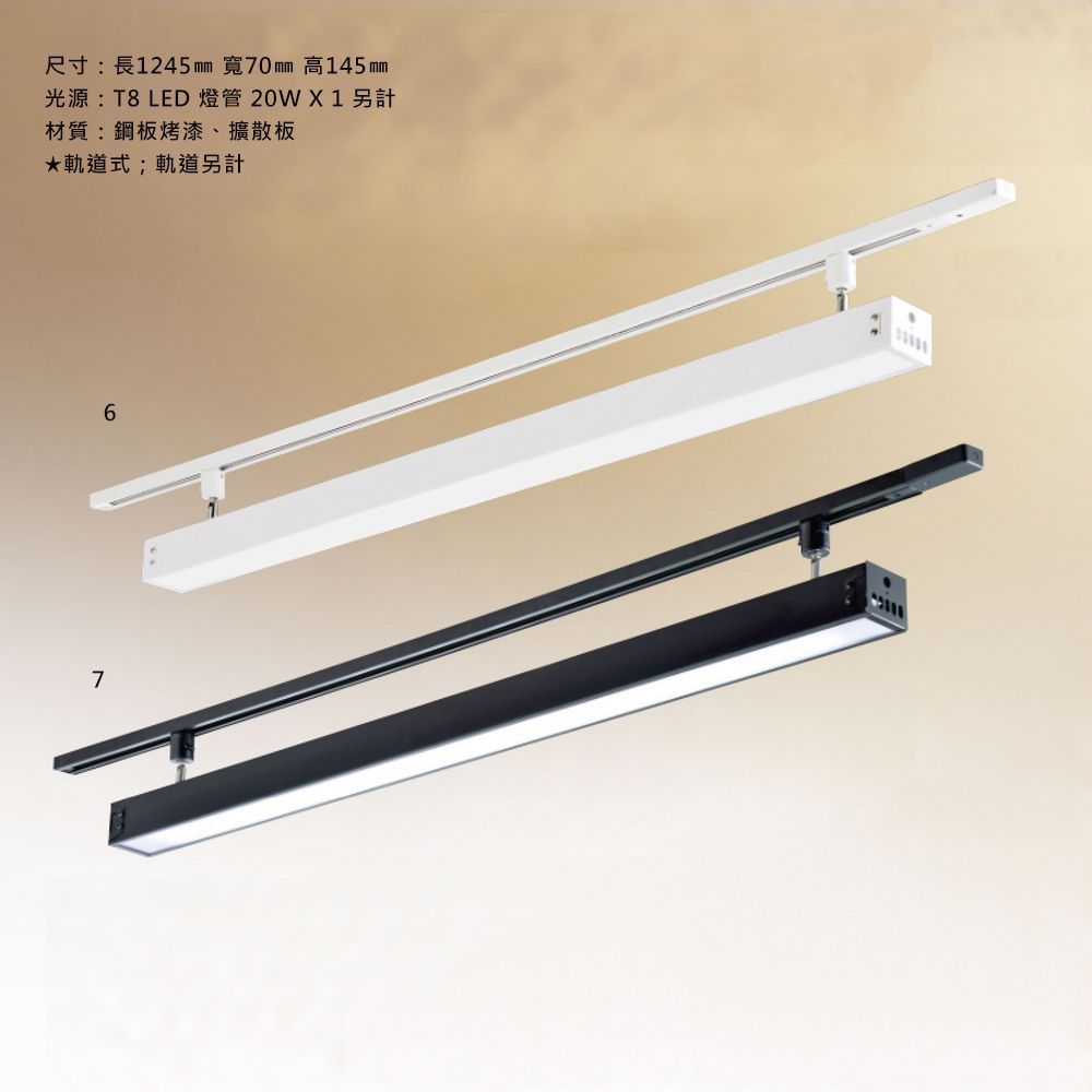 尺寸:長1245㎜ 寬70㎜ 高145㎜ 光源:T8 LED 燈管 20W X 1 另計 材質:鋼板烤漆、擴散板 ★軌道式;軌道另計