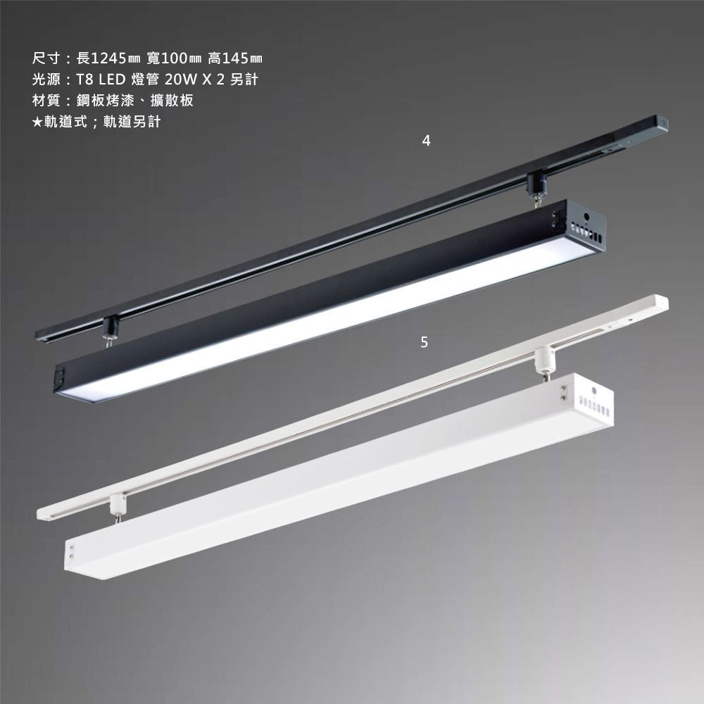 尺寸:長1245㎜ 寬100㎜ 高145㎜ 光源:T8 LED 燈管 20W X 2 另計 材質:鋼板烤漆、擴散板 ★軌道式;軌道另計